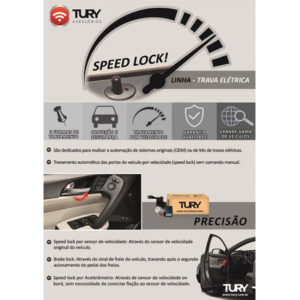 Função Speedlock: caso nenhuma porta esteja aberta, o módulo travará automaticamente as portas quando o veículo atingir uma velocidade específica (sensibilidade programável). Toda a vez em que a porta do veículo for aberta com a ignição ligada, o módulo executará novamente o travamento automático das portas após retomada de movimento pelo veículo. O retravamento ocorrerá no máximo 4 vezes por ciclo de ignição para preservação das travas elétricas. 7 níveis de sensibilidade configuráveis. Função pode ser desativada por programação.
